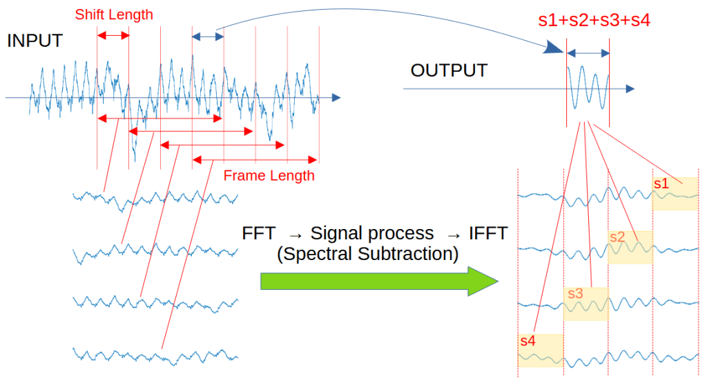 Frame長12.8msで元信号を切り出し,窓関数(Hann)をかけ256点FFTし,ノイズスペクトルを低減した後,256点IFFTで時間波形に戻す.